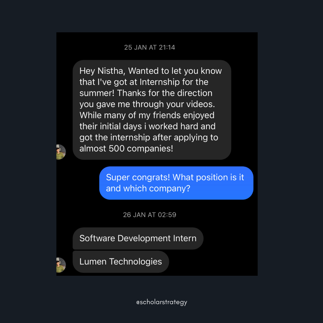 I bagged a summer internship at Chan-Zuckerberg initiative in Bay Area. Internship process went smoothly for me and I applied to only 30 places. It was all because of your guidance that this was so easy for me. Thank you so much!